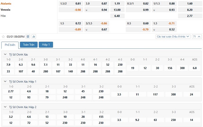Bảng tỷ lệ kèo bóng đá trận đấu Atalanta vs Venezia