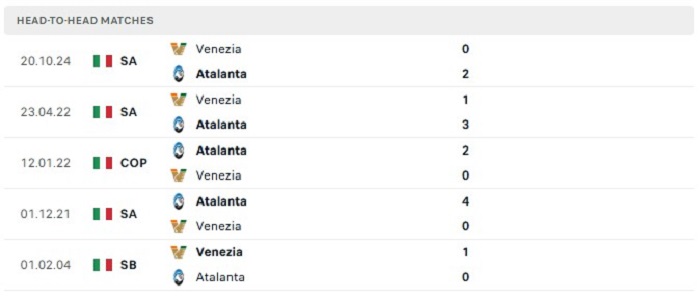 Lịch sử đối đầu của Atalanta vs Venezia